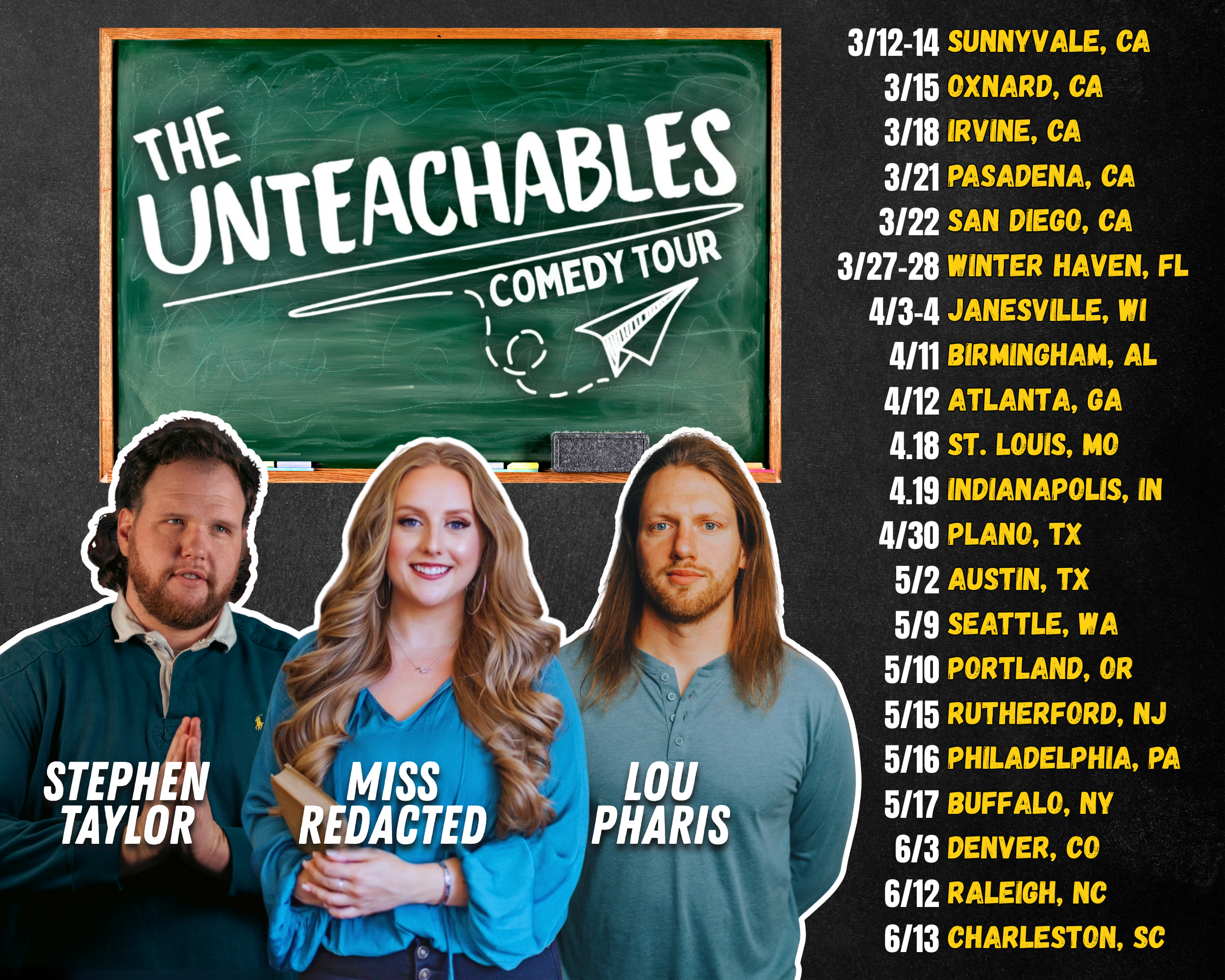 Teacher of the year, fired for posting Tiktoks, Self-demotion to substitute, The Unteachables are unhinged, uncensored, and unforgettable. Known to you as the students who were always the loud kids in the back of the classroom, the Unteachables are a group of stand-up comedians who just happened to fall backwards into educating America’s youth. Their material extends far beyond just the chaos that exists in their classroom. They offer authentic comedy to everyone, regardless of if they've worked in education, need a break from reality, or just love to laugh. The Unteachables have sold out comedy clubs and theaters across all 50 states, and have been featured on NBC, The Breakfast Club, The New York Post, and Sirius XM